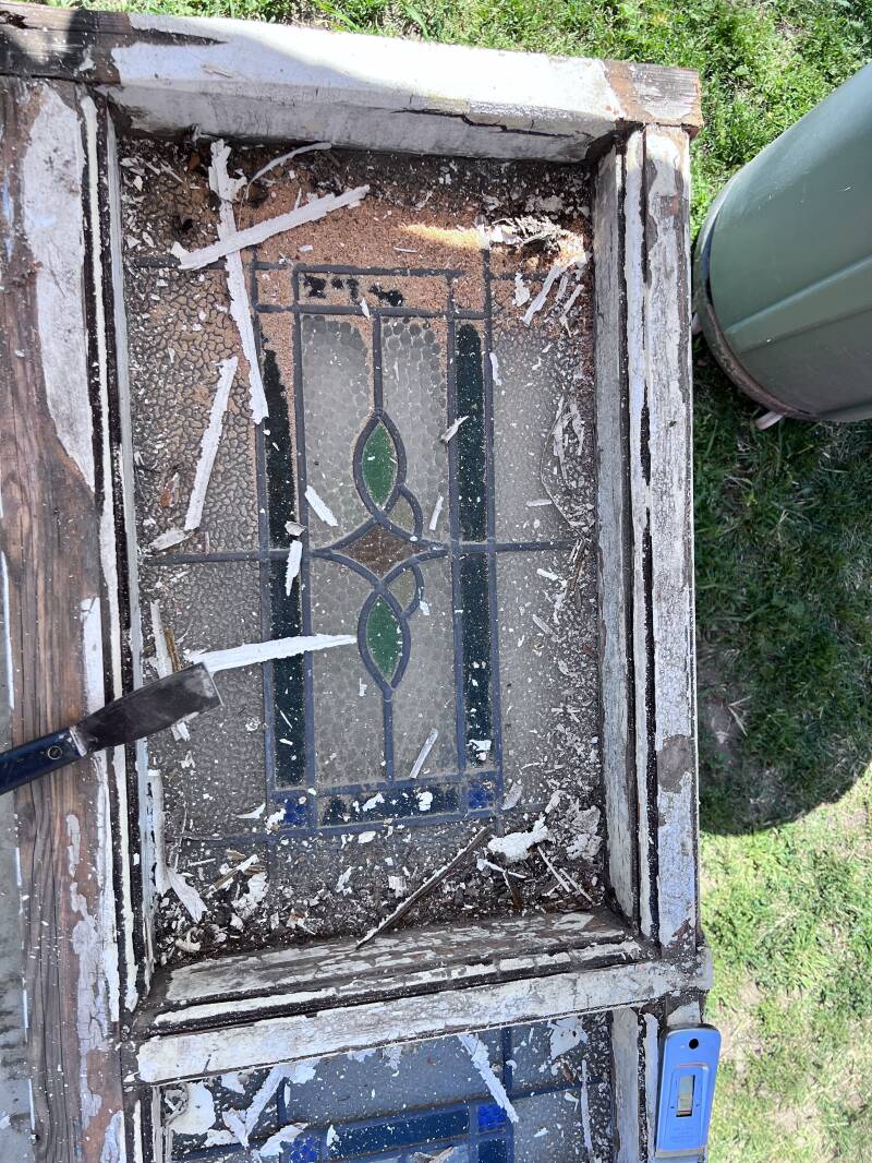The picture above is one of my favorite stained glass pieces. As you can see I paid $40 for it (at a garage sale). The frame around it is about six inches thick. We think it was cut right out of a house or church that was being demolished. Once I cleaned and scraped it, I couldn't bring myself to paint over all of the natural chippy paint and patina wood, so I put a couple of coats of varnish on it and Danny installed it. I love the way it came out!