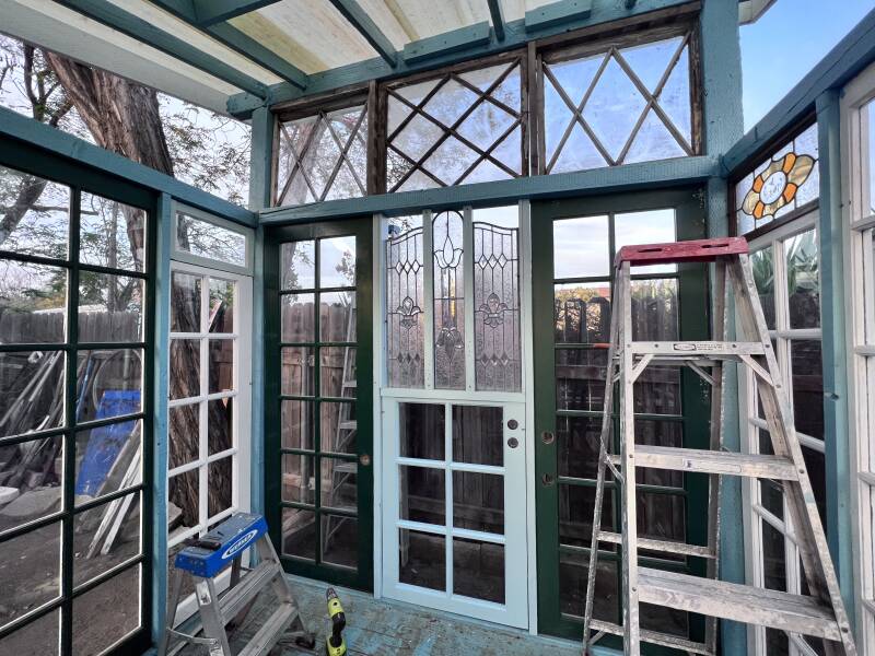 The greenhouse is really coming along. Danny incorporated all my favorite old windows, including the diamond-shaped and stained glass windows I collected. I'm thrilled with how it is turning out. Every time I look at it, it amazes me that the old doors and windows I purchased from yard sales, flea markets, and swap-and-sell sites over the years, with the dream of making them into a greenhouse, are becoming a reality! The overall look is quite eclectic, as is the color scheme.
