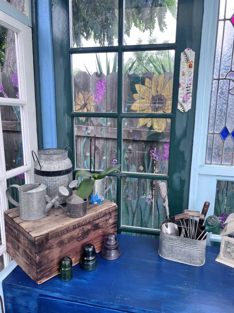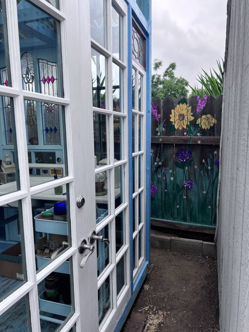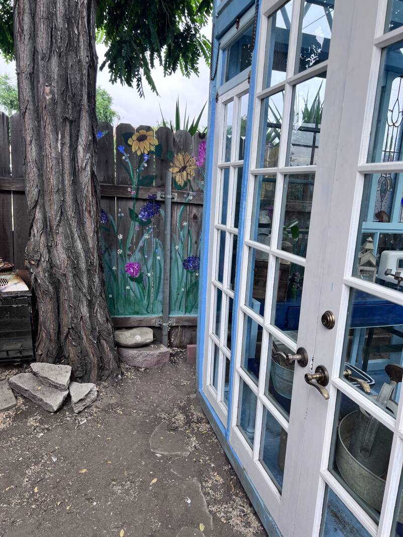 I quickly got tired of looking at the brown fence so I painted some flowers on it to brighten it up. And while I have moved some things into the greenhouse (now also known as my she shed), there is still work that needs to be done, mainly the plumbing and the pavers around the outside. Stay tuned!